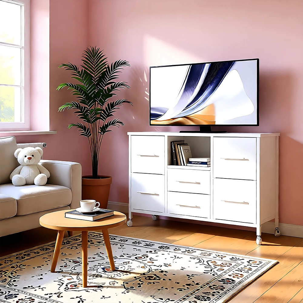 Chest of Drawers for Bedroom Living Room Long TV Stand with Storage Shelf Clothes Storage Unit with 4 Castors Fabric Drawers